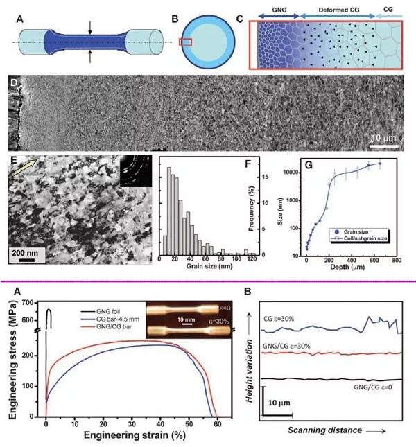 許多生物材料在局部化學(xué)組成或成分以及結(jié)構(gòu)特征上表現(xiàn)出空間梯度,這樣的空間梯度提高了生物材料的力學(xué)性能并賦予一定功能。為了優(yōu)化力學(xué)性能,梯度結(jié)構(gòu)被引入到金屬工程材料中。但在如何合成這種具有空間梯度的金屬材料,一直充滿著挑戰(zhàn)。從結(jié)構(gòu)的提出到實驗室的成功合成,該過程經(jīng)歷了10年之久。第一個成功合成梯度結(jié)構(gòu)金屬材料的是我國沈陽金屬研究所的盧柯院士,并將成果發(fā)表在了Science期刊上,繼而后來引發(fā)了全世界的科研浪潮。目前為止,合成梯度金屬材料的方法主要工藝主要為:a:表面機械摩擦處理(SMAT)是對板狀試樣進行表面機械摩擦處理的一種方法;b:表面機械磨削處理(SMGT)用于處理圓柱形樣品;c:表面機械軋制處理(SMRT)用于處理圓柱形樣品;d:高壓扭轉(zhuǎn)變形,是目前應(yīng)用最多的方法之一。這些方法造成的梯度誘導(dǎo)了孿晶,位錯以及層錯能的梯度。微觀的結(jié)構(gòu)差異改變了宏觀的力學(xué)性能(主要是非均勻的變形行為引起)。納米晶區(qū)強度大,粗晶區(qū)延性好,二者的協(xié)同作用促進了金屬材料的高強度和高延性。梯度晶體結(jié)構(gòu)是一種打破強塑性同時掣肘的很好地方法。TRIP和梯度結(jié)構(gòu)結(jié)合使得奧氏體鋼的塑性增加,但是強度維持不變。梯度結(jié)構(gòu)結(jié)合TWIP可以同時提高材料的強塑性。納米晶金屬塑性差的主要原因是缺乏加工硬化行為,從而導(dǎo)致早期應(yīng)變局部化和失效。梯度結(jié)構(gòu)可以抑制應(yīng)變局部化的早期發(fā)生。因為梯度結(jié)構(gòu)改變了變形機制,機械驅(qū)動納米晶粒生長。梯度結(jié)構(gòu)具有彈塑性均質(zhì)性和塑性非均質(zhì)性,從而形成宏觀應(yīng)變梯度。由于不兼容的變形,應(yīng)變梯度將單軸應(yīng)力轉(zhuǎn)變?yōu)槎噍S應(yīng)力。從粗粒度區(qū)域可以實現(xiàn)應(yīng)變?nèi)ゾ植炕蚝图庸び不?。因此,特殊的?yīng)力分布可能會增強位錯的形核和擴展,并導(dǎo)致額外的應(yīng)變硬化。梯度材料單軸變形柯分為三個階段:1)梯度晶體材料彈性變形;2)中心粗晶層開始變形,但是納米表面層仍然彈性變形;這種不相容性使單軸應(yīng)力轉(zhuǎn)變?yōu)殡p軸應(yīng)力;同時存在兩個彈塑性界面,并隨外加應(yīng)變的增加而向表面移動。出現(xiàn)應(yīng)力應(yīng)變梯度,形成協(xié)同強化和背應(yīng)力,提高屈服強度。3)粗晶層和納米晶層均可塑性變形,穩(wěn)定的頸縮首先發(fā)生在納米顆粒層中。然而,頸縮受到穩(wěn)定的粗粒度層的約束。頸縮層與中心穩(wěn)定層的界面附近出現(xiàn)陡峭的應(yīng)變梯度,通過必要的幾何位錯和背應(yīng)力的積累促進應(yīng)變硬化能力。此外,頸縮/穩(wěn)定界面從表面向中心層遷移,伴隨著高密度位錯的積累,提高了應(yīng)變硬化速率,從而提高了梯度晶材料的延性。在梯度結(jié)構(gòu)中,粗晶層中的位錯誘導(dǎo)硬化和納米層中的晶界遷移誘導(dǎo)軟化同時激活。巨大的應(yīng)變硬化能力主要來源于梯度層中由于不均勻變形產(chǎn)生的大量幾何必須位錯。梯度組織的應(yīng)變硬化速率可與粗晶組織相當(dāng)。利用納米晶粒優(yōu)越的強度、粗大晶粒良好的塑性和梯度分布,實現(xiàn)了應(yīng)變?nèi)ゾ钟蚧皖~外應(yīng)變硬化,發(fā)展了強韌性材料。3.1 盧柯院士首次在《Science》雜志報道梯度銅該文是盧柯院士在國際上第一次合成梯度金屬材料并引起了國際間的極大關(guān)注與討論。該文一經(jīng)發(fā)表就引發(fā)了一股研究梯度材料的浪潮。通常納米金屬材料的強度很高,但是由于缺乏加工硬化行為,其塑性極差。該文通過表面塑性摩擦技術(shù)成功制備得了梯度銅,其顯微結(jié)構(gòu)為中心部位的粗晶層,越往表層晶粒越細,在距離表面深度為150um范圍內(nèi)存在納米梯度層。拉伸性能測試顯示合成的梯度銅具有10倍于粗晶銅的強度,其塑性基本保持不變。研究發(fā)現(xiàn)機械力驅(qū)動梯度層中晶粒的生長是主要的變形機理。這種變形機理導(dǎo)致梯度銅在具有高強度的同時還能維持很好的塑性。