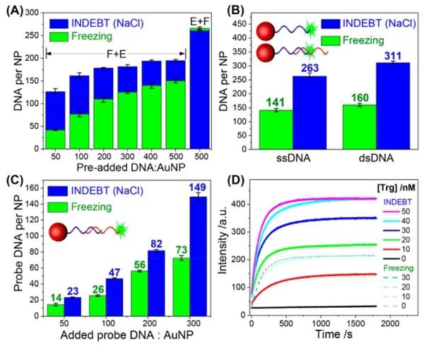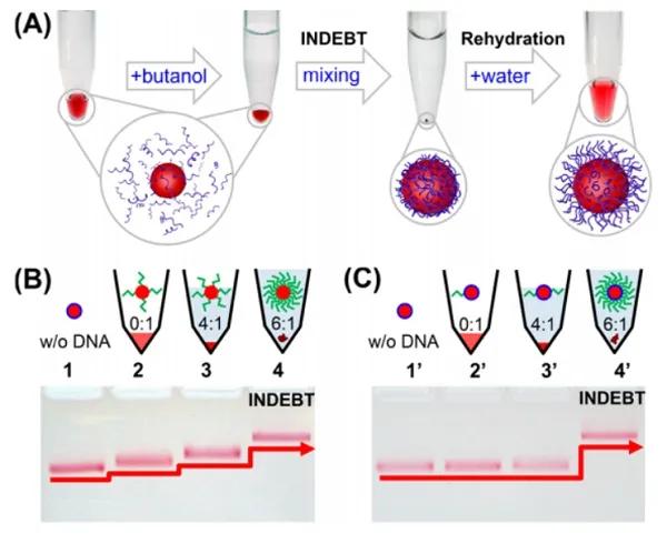 (B-C)凝膠電泳結果顯示,隨丁醇:H2O體積比增加,檸檬酸鹽(B)和磺化三苯基膦(C)保護的15 nm AuNP表面DNA修飾量先緩慢增加(B)或幾乎不變(C),發(fā)生脫水(INDEBT)時DNA接枝量急劇增加。