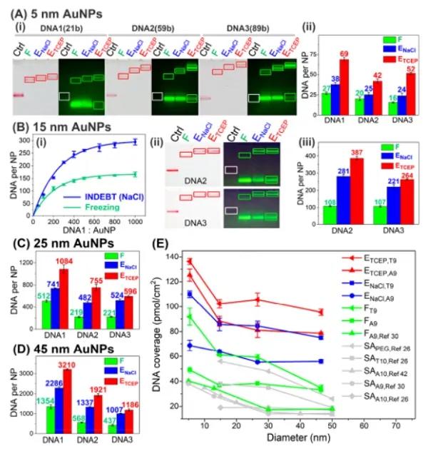 A-D)通過冷凍和INDEBT獲得的系列尺寸(5-45 nm AuNP,21-89b DNA)SNA的電泳圖和熒光DNA定量;