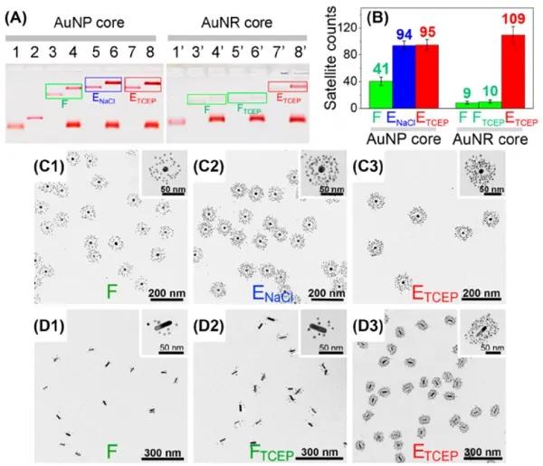 (C-D)以冷凍和INDEBT制備的DNA功能化AuNP和AuNR(金納米棒)為核組裝得到的核-衛(wèi)星結構TEM圖像。