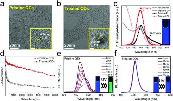 d)的瞬態(tài)吸收(TA,激發(fā)354 nm)漂白恢復曲線的演變,e)原始和f)處理的QDs在紫外線(UV)照射不同時間后的PL光譜。插圖:紫外線照射不同時間后的原始和經(jīng)過處理的量子點的照片。