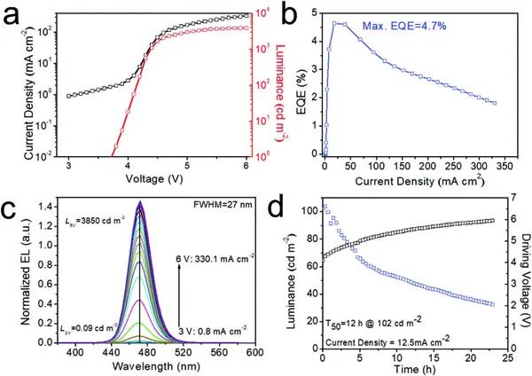 這項工作將酸蝕和配體交換結合起來,制備出高質量的純藍色發(fā)光鈣鈦礦CsPbBr3 QDs。強酸性HBr蝕刻了具有空位缺陷的不完美八面體,并從QDs中去除多余的羧酸鹽配體。然后,通過短支鏈DDDAM鏈和PEA物種之間的配體交換過程,隨后與QDs表面形成強的L型配位作用。這一策略顯著提高了QDs的穩(wěn)定性,消除大量缺陷,獲得97%的量子熒光產(chǎn)率?;谠換Ds的PeLEDs表現(xiàn)出純藍光發(fā)射(470nm)和4.7%的EQE,符合NTSC和Rec.2020標準,是一種理想的藍光發(fā)射。3850cd m-2的亮度和12小時的半衰期也是迄今為止所報道的純藍光PeLEDs的最高亮度和穩(wěn)定性表現(xiàn)。因此,這一策略為推動PeLEDs的發(fā)展和應用提供了一種途徑。