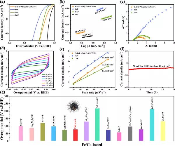 a)2D Co@Fe/1D Fe-doped Co氫氧化物的SEM圖像;b)2D/1D CoFeP NSs@Fe-CoP NWs樣品的SEM圖像;c,d) Fe-CoP納米線不同放大倍數(shù)下的TEM圖像;e) 2D/1DCoFeP NSs@Fe-CoP NWs樣品的TEM圖像;f)CoFeP納米片的HRTEM圖像以及SAED圖案;g)Fe-CoP納米線的HRTEM圖像以及SAED圖案。圖3. 2D/1D CoFeP NSs@Fe-CoP NWs催化劑在堿性電解質(zhì)中HER的電化學(xué)表征