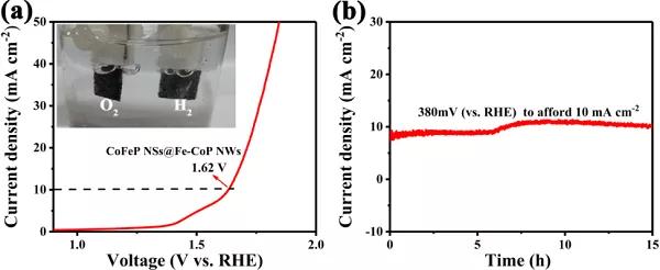 a)CoFeP NSs@Fe-CoP NWs樣品的極化曲線圖;b)CoFeP NSs@Fe-CoP NWs樣品在恒電位下的耐久性測試圖。該研究首次通過過飽和觸發(fā)維度和相控生長策略構(gòu)建2D/1D CoFeP NSs@Fe-CoP NWs異質(zhì)結(jié)構(gòu),且此催化劑表現(xiàn)出優(yōu)越的HER,OER和全水解電催化性能。該合成策略能夠用于設(shè)計具有優(yōu)異的多功能電催化性能的2D/1D磷化物異質(zhì)結(jié)構(gòu)催化劑,也將為推進(jìn)能源相關(guān)應(yīng)用的多維納米結(jié)構(gòu)開辟另一種途徑。
