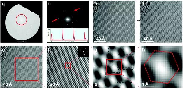 圖5. TEM和圖像(h)紅色虛線表示六元環(huán),其最近鄰原子距離為1.42。兩側(cè)相交處有一個(gè)碳原子