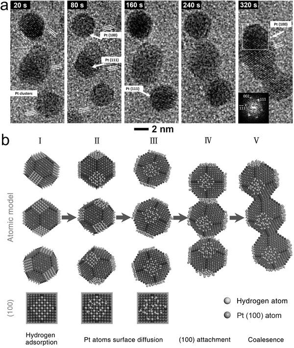 圖8 鉑納米線形成過(guò)程中的定向連接及原子模型:a 原位電鏡下Pt納米顆粒在Pt(100)晶面的定向連接過(guò)程;b Pt納米顆粒定向連接初始階段的原子模型示意圖,包括:氫吸附,Pt納米顆粒晶面上的擴(kuò)散增強(qiáng),Pt(100)晶面上的定向接觸、連接過(guò)程。