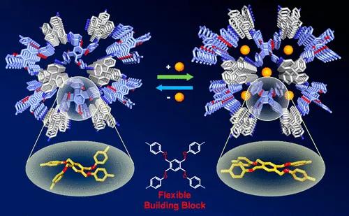 三維共價(jià)有機(jī)框架(3D COFs)的構(gòu)建是非常困難的,因?yàn)樗鼈兊暮铣沈?qū)動(dòng)力主要來自共價(jià)鍵的形成。為了便于合成,剛性結(jié)構(gòu)單元始終是設(shè)計(jì)3D COFs的首選。原則上,用柔性的單元構(gòu)建3D COFs應(yīng)該很有吸引力,但是此類系統(tǒng)的發(fā)展遇到了瓶頸,尤其是在設(shè)計(jì)合成和結(jié)構(gòu)確定方面。這項(xiàng)成果報(bào)道了一種新型的高度結(jié)晶的3D COF (FCOF-5),在結(jié)構(gòu)基元主鏈中具有柔性的C–O單鍵。有趣的是,F(xiàn)COF-5是柔性的,在蒸汽吸附/解吸時(shí)發(fā)生可逆的膨脹/收縮,表明存在呼吸運(yùn)動(dòng)。進(jìn)一步制備了一種具有FCOF-5結(jié)構(gòu)的智能軟聚合物復(fù)合膜,該復(fù)合膜具有可逆的蒸汽觸發(fā)相變。因此,由柔性單元構(gòu)建的3D COFs可以表現(xiàn)出有趣的呼吸行為,這種柔性多孔晶體將具有多種有趣特性。