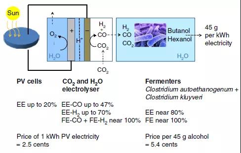 針對(duì)這一問(wèn)題,德國(guó)西門(mén)子公司的Guenter Schmid(通訊作者)團(tuán)隊(duì)[1]利用了可商用的銀基氣體擴(kuò)散電極。該電極通常使用在工業(yè)規(guī)模的氯-堿電解過(guò)程中,而研究人員則以此電極作為二氧化碳電解槽的陰極。檢測(cè)發(fā)現(xiàn),由此形成的電解槽在超過(guò)1200小時(shí)的連續(xù)運(yùn)行后,電流密度依然可高達(dá)300?mA cm–2。這一二氧化碳電解槽可被連接到發(fā)酵模塊(fermentation module),這樣一來(lái),從電解槽出來(lái)的合成氣可以直接轉(zhuǎn)化成具有高碳選擇性的丁醇和己醇。研究計(jì)算顯示。光伏電能、二氧化碳和水轉(zhuǎn)變成醇類(lèi)的法拉第效率可接近達(dá)到100%。利用這一雜化系統(tǒng),研究表示人工光合成高價(jià)值化學(xué)品(丁醇/己醇)可能達(dá)到幾萬(wàn)噸每年的產(chǎn)量,已經(jīng)接近工業(yè)化規(guī)模水平。