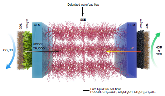 在二氧化碳電解轉(zhuǎn)化成的產(chǎn)物中,甲酸是一種比較有價(jià)值的化學(xué)品。然而,電催化二氧化碳還原通常在電解質(zhì)溶液中進(jìn)行以便電極之間發(fā)生離子傳導(dǎo),因此電催化轉(zhuǎn)化甲酸過(guò)程的產(chǎn)物通常與可溶性性鹽混合形成甲酸鹽,需要耗能的下游分離步驟進(jìn)一步純化產(chǎn)物。這就限制了二氧化碳還原甲酸的工業(yè)化發(fā)展。