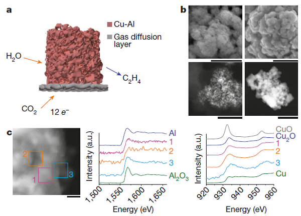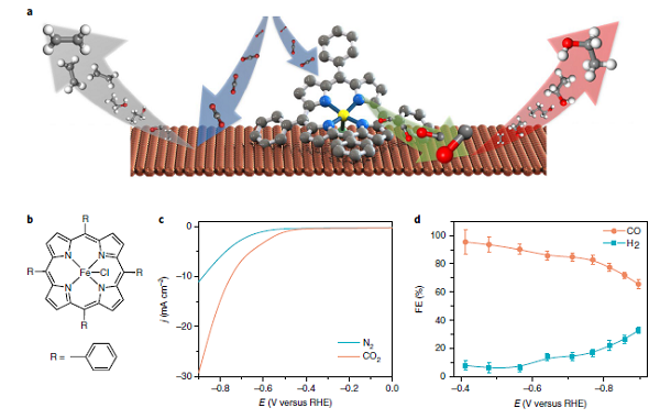 多倫多大學(xué)的Edward H. Sargent(通訊作者)課題組[3]提出了一種分子-金屬催化劑表面的協(xié)同催化劑設(shè)計(jì)。這一設(shè)計(jì)旨在建立富含反應(yīng)中間體的局部環(huán)境,從而提高從二氧化碳和水電合成乙醇的能力。研究人員首先利用一系列能夠催化二氧化碳形成一氧化碳的卟啉基金屬?gòu)?fù)合物對(duì)銅表面進(jìn)行功能化,再利用DFT計(jì)算和拉曼、X射線等譜學(xué)表征,發(fā)現(xiàn)局部一氧化碳展現(xiàn)出高濃度特點(diǎn),能夠有利于碳碳耦合、控制反應(yīng)路徑以高效生產(chǎn)乙醇。驗(yàn)證實(shí)驗(yàn)的結(jié)果,二氧化碳-乙醇轉(zhuǎn)變的局部電流密度也達(dá)到了(124?mA?cm?2)(?0.82 V vs RHE),但由于抑制氫氣生成的問(wèn)題沒(méi)有解決,其法拉第效率略有下降(41%)。這一催化劑后又被集成到薄膜電極組裝系統(tǒng),也實(shí)現(xiàn)了13%左右的全局能量效率。
