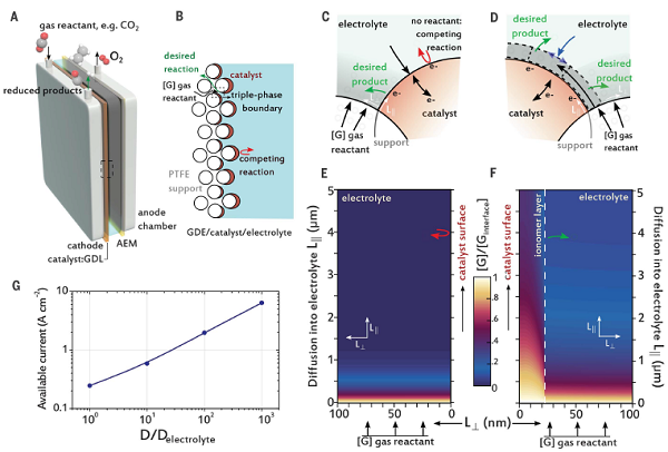 二氧化碳電化學(xué)還原產(chǎn)生C2化學(xué)品的另外一個(gè)挑戰(zhàn)是生成的氣體都是疏水的,而產(chǎn)物反應(yīng)又需要水分子的參與。氣體往往需要擴(kuò)散穿過(guò)液態(tài)電解質(zhì)與催化劑表面接觸,這也限制了C2生產(chǎn)能力的進(jìn)步。為了克服這一問(wèn)題,多倫多大學(xué)的Edward H. Sargent和David Sinton(共同通訊作者)合作[4]將離子聚合物(ionomer)組裝體和銅電催化劑結(jié)合形成新型3D催化劑。這一復(fù)合催化劑具有離子聚合物體相異質(zhì)結(jié)(CIBH)結(jié)構(gòu),能夠分離氣體、離子和電子輸運(yùn)。這一結(jié)構(gòu)包含金屬層和超精細(xì)離子聚合物層,其中離子聚合物層進(jìn)行了疏水和親水功能化,能夠組裝形成結(jié)構(gòu)差異化的形貌,并有利于氣體和離子在金屬表面的輸運(yùn):氣體傳輸可通過(guò)疏水區(qū)域的側(cè)鏈進(jìn)行提升,使氣體擴(kuò)散得以擴(kuò)展;同時(shí),水的吸收和離子出現(xiàn)在親水區(qū)域。由此帶來(lái)的結(jié)果是,活性位點(diǎn)附近的氣體反應(yīng)物、離子和電子大幅增加,反應(yīng)界面由亞微米尺度提升到了幾個(gè)毫米水平。以此為策略設(shè)計(jì)的催化劑在7M磷酸鹽電解質(zhì)中實(shí)現(xiàn)了高效的二氧化碳電還原反應(yīng),乙烯的局部電流密度可以到達(dá)1.3 A cm?2(陰極能量效率為45%)。這一電流密度是迄今為止在二氧化碳生產(chǎn)C2化學(xué)品過(guò)程中觀測(cè)到的最高值,已經(jīng)可以完全滿(mǎn)足工業(yè)規(guī)模相關(guān)的應(yīng)用需求。