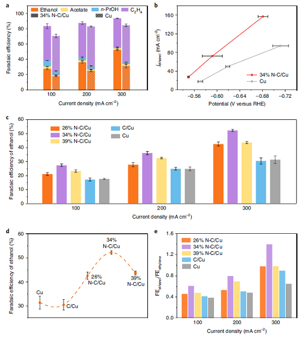 而在二氧化碳電還原反應(yīng)中,乙醇和乙烯是兩種主要的C2競(jìng)爭(zhēng)產(chǎn)物。一般認(rèn)為,這兩種產(chǎn)物衍生自共同的關(guān)鍵中間體(HOCCH*),HOCCH*中碳氧鍵斷裂產(chǎn)生了乙烯。對(duì)二氧化碳電還原反應(yīng)進(jìn)行技術(shù)經(jīng)濟(jì)分析發(fā)現(xiàn),只有當(dāng)局部電流密度超過(guò)100 mA cm?2時(shí),C2產(chǎn)物才會(huì)開(kāi)始產(chǎn)生經(jīng)濟(jì)效益。這意味著即使二氧化碳電還原反應(yīng)的全局電流密度超過(guò)10 mA cm?2,乙醇產(chǎn)物的法拉第效率需要進(jìn)一步提高才能推進(jìn)商業(yè)化。Edward H. Sargent(通訊作者)的團(tuán)隊(duì)[5]報(bào)道了一類(lèi)可實(shí)現(xiàn)52%左右乙醇法拉第效率和31%乙醇陰極能量效率的催化劑。研究發(fā)現(xiàn),在銅表面涂覆氮摻雜碳層,賦予了催化劑強(qiáng)大的供電子能力,可以在HOCCH*中提高碳碳鍵的耦合、抑制碳氧鍵的斷裂,從而增強(qiáng)二氧化碳電還原過(guò)程中的乙醇產(chǎn)物選擇性。根據(jù)該研究的數(shù)據(jù),利用氮摻雜碳層改性后銅催化劑在電流密度超過(guò)100 mA cm?2時(shí)的總法拉第效率高達(dá)83%,乙醇的法拉第效率也大幅提高,超過(guò)了已有報(bào)道的最佳數(shù)值(41%)。