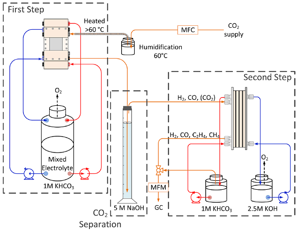 而近期,西門(mén)子公司的N. S. Romero Cuellar(通訊作者)等人[7]提出了一種新型的兩步電解法,展示了其工業(yè)化前景。作者利用兩塊分別以銀和銅作為氣體擴(kuò)散電極的液流電池,將兩步二氧化碳電化學(xué)還原過(guò)程進(jìn)行集成化。在這一集成系統(tǒng)中,作者實(shí)現(xiàn)了電解質(zhì)、氣體和電極之間的巨大三相邊界區(qū)域,由此可以在工業(yè)級(jí)電流密度水平操作運(yùn)行電化學(xué)還原過(guò)程。作者首先利用電壓/電流密度變化線掃分別研究?jī)蓚€(gè)電解槽;而在分析第二個(gè)電解槽時(shí),作者假定供應(yīng)第一步的二氧化碳不會(huì)全部轉(zhuǎn)化成一氧化碳,即第一步的產(chǎn)物氣體是一氧化碳/二氧化碳的混合氣。以此假定,作者研究了不同比例混合氣的電還原反應(yīng),并發(fā)現(xiàn)二氧化碳的占比越高一氧化碳轉(zhuǎn)換成多碳產(chǎn)物的效率越低。因此,作者在第二步中用氫氧化碳吸附二氧化碳,從而有效增加集成系統(tǒng)的全局法拉第效率。根據(jù)計(jì)算,這一兩步策略的多碳產(chǎn)物(C2和C3)累計(jì)法拉第效率可以達(dá)到62%。