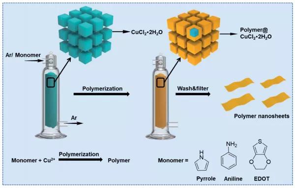 2D過渡金屬氮化物,尤其是富氮的氮化鎢(WxNy,y>x),例如W3N4和W2N3,由于大量的W-N大大提高了催化活性,具有很大的產(chǎn)氫反應(yīng)(HER)潛力。但是,由于W-N鍵的形成能量大,因此合理合成2D富氮氮化鎢具有挑戰(zhàn)性。本文中,通過鹽模板法在大氣壓力下合成了超薄的2D六角形W2N3(h-W2N3)薄片。由于KCl和h-W2N3之間的強相互作用和疇匹配外延,h-W2N3的形成能可以大大降低。2D h-W2N3對陰極HER表現(xiàn)出出色的催化活性,起始電勢為-30.8 mV,對于10 mA/cm2,其超電勢為-98.2 mV。Atmospheric-Pressure Synthesis of 2D Nitrogen-Rich Tungsten Nitride.(Adv. Mater., 2018, DOI:10.1002/adma.201805655)2.J. Mater. Chem. A:通過鹽模板方法大規(guī)模合成可調(diào)節(jié)尺寸和厚度的導(dǎo)電聚合物納米片