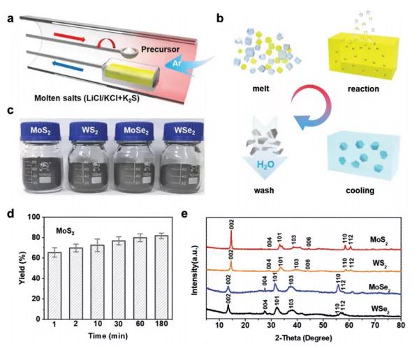 2D過渡金屬二硫化碳(TMD)由于其厚度相關(guān)的化學(xué)和物理特性而非常適合于能量存儲和場效應(yīng)晶體管。但是,由于當(dāng)前的二維TMD合成方法無法兼具液相合成和化學(xué)氣相沉積的優(yōu)點,因此仍然對大規(guī)模生產(chǎn)仍然是巨大的挑戰(zhàn)高質(zhì)量的2D TMD。在此,報道了一種熔融鹽方法,該方法可大規(guī)模合成厚度小于5 nm的各種高結(jié)晶度TMDs納米片(MoS2,WS2,MoSe2和WSe2),產(chǎn)率超過68%,反應(yīng)時間僅數(shù)分鐘。另外,可以通過調(diào)節(jié)反應(yīng)時間和溫度容易地控制合成后的納米片的厚度和尺寸。合成后的MoSe2納米片作為假電容材料具有良好的電化學(xué)性能。進(jìn)一步預(yù)期該工作將為快速大規(guī)模生產(chǎn)用于能源相關(guān)應(yīng)用及其他領(lǐng)域的高質(zhì)量非氧化物納米片提供有希望的策略。Mass Production of High-Quality Transition Metal Dichalcogenides Nanosheets via a Molten Salt Method.