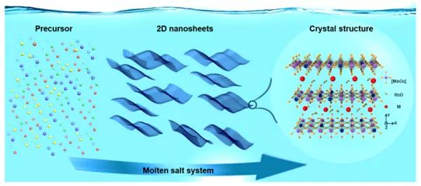 導(dǎo)電聚合物納米片由于其獨特的光學(xué)和電學(xué)性質(zhì)而在許多有趣的應(yīng)用中很有希望。然而,以容易的方式來制造具有大的可擴展性的特征的尺寸和厚度可調(diào)的導(dǎo)電聚合物納米片仍然是挑戰(zhàn)。作者開發(fā)了一種在單體氣體與CuCl2·2H2O鹽之間的氣固界面上大規(guī)模合成各種導(dǎo)電聚合物納米片的新方法。所獲得的聚合物納米片的厚度可以從2.1nm調(diào)整到8.8nm。此外,在CuCl2·2H2O膜的表面制備了高導(dǎo)電性,柔韌性和大面積的PPy膜,其透明度為85%。PPy納米片組裝的獨立式電極表現(xiàn)出320 F/cm3的高體積電容和高倍率能力。這種簡便且成本有效的方法可以大量生產(chǎn)導(dǎo)電聚合物納米片,并有望在潛在的實際應(yīng)用中使用。Large-scale synthesis of size- and thickness-tunable conducting polymer nanosheets via a salt-templated method.(J. Mater. Chem. A, 2019, DOI:10.1039/c9ta08617j)3.Adv. Funct. Mater.:熔融鹽法大規(guī)模生產(chǎn)高質(zhì)量的過渡金屬二硫?qū)僭鼗锛{米片
