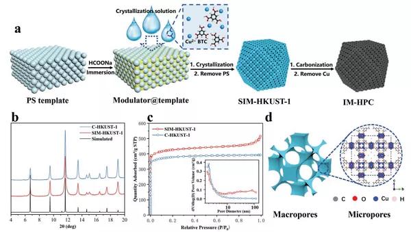 二維(2D)層狀MnO2材料由奇異的電子特性和帶有堿金屬離子的活性位組成,為開發(fā)具有化學(xué)修飾的催化劑提供了一個全面的平臺。值得注意的是,含K+的層狀MnO2催化劑已被證明是甲醛催化氧化(HCHO)的強力候選者。揭示活性部位上的堿金屬離子的影響對于了解反應(yīng)物與活性中心之間的相互作用至關(guān)重要。通過將分析工具與周期性計算密度泛函理論模型相結(jié)合,通過比較三種典型的插入的堿金屬離子(Na+,K+,和Cs+)層狀MnO2材料。這些材料是通過熔融鹽法合成的,具有高收率,較大的橫向尺寸和納米厚度。文章證明了堿金屬離子可以通過CsMnO(1.94 eV)<KMnO(1.97eV)<NaMnO(2.07eV)<理想的MnO2表面而無插入離子(2.23 eV)的順序顯著改變Vo的形成能。結(jié)果,具有最多表面Vo位置的CsMnO可以實現(xiàn)有效的HCHO氧化為CO2,在40°C的200 ppm HCHO/潮濕空氣中,HCHO的消耗速率約為0.149 mmol/(g·h)。與Mars-van-Krevelen過程不同,量子化學(xué)計算和原位漫反射紅外傅里葉變換光譜表明,主要反應(yīng)途徑可能是HCHO(ad)+[O](ad)→DOM→[HCOO-]s→通過Langmuir-Hinshelwood(LH)機制產(chǎn)生的CO2。堿金屬通過在Vo位點捕獲氧并加速吸附的氧與吸附的HCHO到深度降解產(chǎn)物(CO2和H2O)之間的易反應(yīng),顯著促進(jìn)了HCHO的轉(zhuǎn)化。Unveiling the Effects of Alkali Metal Ions Intercalated in Layered MnO2 for Formaldehyde Catalytic Oxidation.(ACS Catal., 2020, DOI:10.1021/acscatal.0c02310)7.Adv. Energy Mater.:超級電容器用有序大孔微晶單晶MOF及其衍生碳材料的制備