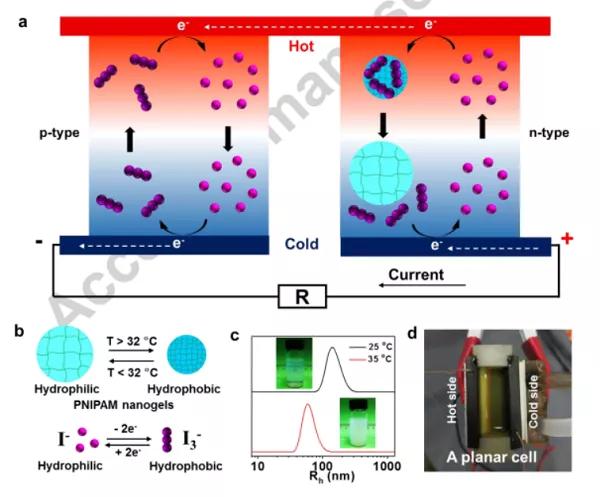 熱原電池(TGC)是將熱能直接轉(zhuǎn)換為穩(wěn)定的電力輸出的有前途的設(shè)備。目前,由于有限的溫差而產(chǎn)生的低電壓(毫伏級)嚴(yán)重阻礙了TGC的實際應(yīng)用。改善電壓的一種通用策略是交替串聯(lián)連接n型和p型氧化還原單元。但是,可能的氧化還原種類的數(shù)量受到限制,從而阻礙了器件串聯(lián)堆疊的優(yōu)化。在這項工作中,作者報告了一個新穎的概念,該概念使得能夠通過聚(N-異丙基丙烯酰胺)(PNIPAM)熱敏納米凝膠誘導(dǎo)的碘化物/三碘化物氧化還原對進(jìn)行pn轉(zhuǎn)換,塞貝克系數(shù)從0.71 mV/K變?yōu)?1.91 mV/K。結(jié)果證明,納米凝膠能夠在熱側(cè)選擇性捕獲I3-,然后在冷側(cè)釋放I3-,從而產(chǎn)生游離I3-的濃度梯度,從而導(dǎo)致p-n轉(zhuǎn)化。此外,我們設(shè)計了一種可穿戴設(shè)備,該設(shè)備由交替的I-/I3-和I-/I3-/納諾格斯串聯(lián)構(gòu)成,通過利用人體熱量產(chǎn)生大約1 V的開路電壓和大約9μW的輸出功率。這項工作開發(fā)了一種新的方法來逆轉(zhuǎn)氧化還原對的塞貝克效應(yīng),并且對于擴展TGC中可能的氧化還原物質(zhì)的庫非常重要。P-N Conversion in Thermogalvanic Cells Induced by Thermosensitive Nanogels for Body Heat Harvesting.(Nano Energy, 2018, DOI:10.1016/j.nanoen.2018.12.073)