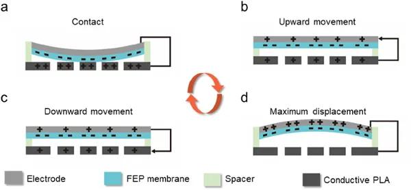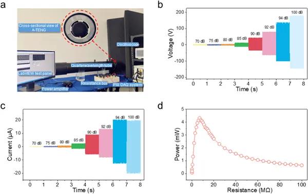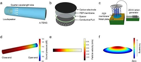 低頻聲能在學(xué)術(shù)領(lǐng)域和工業(yè)界都受到了極大的關(guān)注。在我們的生活環(huán)境中,低頻聲波波長(zhǎng)較長(zhǎng),不易被吸收或隔離。但是,這種機(jī)械能如果采用適當(dāng)?shù)钠骷O(shè)計(jì)和能量轉(zhuǎn)換方法,如壓電法和電磁法,可以將其采集并轉(zhuǎn)化為電能,有望實(shí)現(xiàn)對(duì)電子器件的供電。對(duì)于壓電器件,通常采用高壓電系數(shù)的陶瓷材料,但其與空氣的阻抗不匹配極大影響了聲電轉(zhuǎn)換效能的提升。對(duì)于電磁方式,通常需要線圈、磁鐵等笨重的部件,不利于微弱環(huán)境聲能量采集系統(tǒng)的實(shí)現(xiàn)。近年來,王中林院士提出的新型摩擦納米發(fā)電機(jī)(TENG)在聲能采集領(lǐng)域顯示出廣闊的前景。與壓電聲學(xué)器件相比,TENG器件常具有軟、柔性的特點(diǎn),可以顯著降低能量采集器與入射聲波之間的聲阻抗失配,以提高聲能量收集裝置的輸出功率。此外,摩擦電器件具有廣泛的材料選擇性,給器件的制作及實(shí)現(xiàn)帶來了極大便利。到目前為止,已經(jīng)有幾項(xiàng)研究顯示了TENG在聲波能量收集和自供電傳感方面的潛力。上述器件主要采用實(shí)現(xiàn)聲壓增強(qiáng)的亥姆霍茲聲諧振器。然而,當(dāng)亥姆霍茲諧振腔底部采用柔性膜時(shí),往往會(huì)出現(xiàn)聲壓放大效果的降低。此外,基于亥姆霍茲諧振器的聲能采集器對(duì)柔性部件的變化非常敏感,這表明要實(shí)現(xiàn)最優(yōu)性能,需要復(fù)雜的調(diào)試工程。實(shí)際上,四分之一波長(zhǎng)諧振器是另一種重要的聲學(xué)諧振器,與亥姆霍茲諧振器相比,它具有設(shè)計(jì)簡(jiǎn)單、制作方便等獨(dú)特的優(yōu)點(diǎn)。但這種結(jié)構(gòu)在聲學(xué)TENG領(lǐng)域還沒有得到足夠的重視。此外,對(duì)于聲摩擦納米發(fā)電器件,其關(guān)鍵部件之一是用于聲波傳播的穿孔板。在以往的研究中,這一層通常由多孔材料組成,如微穿孔鋁、導(dǎo)電織物、泡沫銅等。然而,這些材料的孔徑很難調(diào)控,粘滯損失對(duì)聲衰減的影響也沒有進(jìn)行探討,對(duì)孔的加工工序也較復(fù)雜。針對(duì)上述問題,近日,在南京郵電大學(xué)謝燕楠教授和袁明副教授研究團(tuán)隊(duì),提出了一種3D打印的聲學(xué)摩擦納米發(fā)電機(jī)(A-TENG),具有結(jié)構(gòu)可控、一次性成型、制作簡(jiǎn)單、成本低等特點(diǎn)。通過四分之一波長(zhǎng)管優(yōu)異的放大性能及器件參數(shù)的合理設(shè)計(jì),該系統(tǒng)在100 dB聲壓級(jí)激勵(lì)下能夠產(chǎn)生4.33 mW的峰值功率輸出,實(shí)現(xiàn)對(duì)72個(gè)LED的驅(qū)動(dòng)。當(dāng)聲壓級(jí)為90分貝時(shí),即可驅(qū)動(dòng)一個(gè)商用計(jì)算器連續(xù)工作,表明其作為低功耗電子設(shè)備電源的應(yīng)用前景。此外,團(tuán)隊(duì)還開發(fā)了由A-TENG、AI語音識(shí)別芯片和控制電路組成的智能邊緣系統(tǒng)。語音信號(hào)首先可以通過A-TENG轉(zhuǎn)化為電信號(hào),然后由內(nèi)置預(yù)訓(xùn)練的AI芯片進(jìn)行邊緣識(shí)別和處理,產(chǎn)生相應(yīng)的指令動(dòng)作來控制后續(xù)電路。該智能邊緣系統(tǒng)無需云計(jì)算即可實(shí)現(xiàn)實(shí)時(shí)語音識(shí)別,展示了聲學(xué)TENG在低功耗、高性價(jià)比的物聯(lián)網(wǎng)領(lǐng)域的巨大潛力。該成果以題為“A 3D-printed acoustic triboelectric nanogenerator for quarter-wavelength acoustic energy harvesting and self-powered edge sensing”發(fā)表在Nano Energy上(IF 16.602)。圖1 四分之一波長(zhǎng)聲能采集系統(tǒng)的示意圖