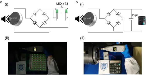 (a)聲學(xué)系統(tǒng)直接點(diǎn)亮了72個(gè)綠色LED。(b)不帶電池的商用計(jì)算器由聲學(xué)系統(tǒng)連續(xù)驅(qū)動(dòng)。圖5 A-TENG對(duì)1 kHz內(nèi)聲頻范圍的響應(yīng)