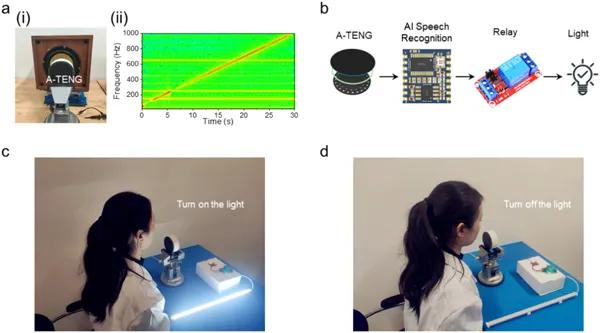 (a)在20~1000 Hz范圍內(nèi)對(duì)A-TENG聯(lián)合時(shí)頻分析的實(shí)驗(yàn)裝置和測(cè)量結(jié)果。(b)自供電聲學(xué)AI邊緣系統(tǒng)示意圖。(c-d)在沒有云計(jì)算的情況下展示用于實(shí)時(shí)語音識(shí)別的自供電邊緣智能系統(tǒng)。綜上所述,提出了一種3D打印的A-TENG,具有結(jié)構(gòu)可控、一次性成型、制作簡(jiǎn)單、成本低的特點(diǎn)。借助于四分之一波長(zhǎng)管,在100 dB SPL激勵(lì)下,A-TENG可以提供4.33 mW的功率輸出,這足以直接驅(qū)動(dòng)72個(gè)LED和一臺(tái)商用計(jì)算器。此外,還開發(fā)了基于A-TENG的自驅(qū)動(dòng)傳感系統(tǒng),用于智能語音識(shí)別。該系統(tǒng)包括將語音信號(hào)轉(zhuǎn)換為電信號(hào)的A-TENG、內(nèi)置并預(yù)先訓(xùn)練好的神經(jīng)網(wǎng)絡(luò)處理傳感信號(hào)的AI語音識(shí)別芯片和執(zhí)行指令的控制電路。該智能感知組件無需云計(jì)算即可在物聯(lián)網(wǎng)的邊緣端實(shí)現(xiàn)語音指令識(shí)別與控制,是一種低功耗、低成本的智能邊緣系統(tǒng)。通過將TENG與人工智能技術(shù)的結(jié)合,可構(gòu)建更全面的智能自驅(qū)動(dòng)系統(tǒng),將是令人振奮的發(fā)展方向。這些智能系統(tǒng)可以部署在物聯(lián)網(wǎng)的邊緣,具有獨(dú)立于云計(jì)算、低功耗、長(zhǎng)期運(yùn)行免維護(hù)等優(yōu)勢(shì)。