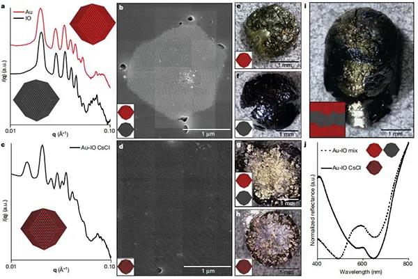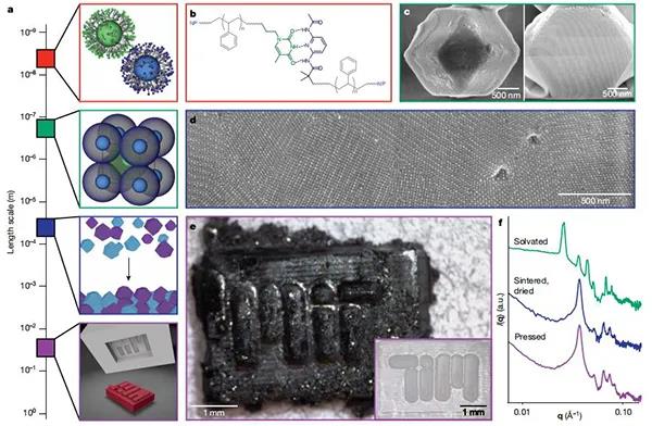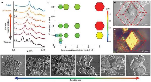 納米顆粒組裝已經(jīng)被提出作為一種理想的方法來構(gòu)建材料的層次組織,通過選擇納米尺度的組件來自下而上構(gòu)建整個材料。多尺度結(jié)構(gòu)控制是非??扇〉?,這是源于化學(xué)組成、納米尺度順序、微觀結(jié)構(gòu)和宏觀形式都影響物理性質(zhì)。然而,通常決定納米顆粒有序的化學(xué)相互作用,并不能提供任何在更大長度尺度上操縱結(jié)構(gòu)的手段。微觀結(jié)構(gòu)和宏觀形態(tài)仍然是未充分探索的設(shè)計參數(shù),開發(fā)能夠?qū)蝹€自組裝結(jié)構(gòu)結(jié)合成宏觀的加工技術(shù),將是開發(fā)在所有尺寸狀態(tài)下具有完全結(jié)構(gòu)控制的納米顆粒的重要步驟。因此,基于納米顆粒的材料開發(fā)需要在不犧牲其自組裝納米級排列的情況下,定制微觀和宏觀結(jié)構(gòu)的加工策略。其中,納米復(fù)合技術(shù)(NCT)非常適合生產(chǎn)此類分層材料,源于其固有的可伸縮成分組成,并使用動態(tài)結(jié)合相互作用來決定納米顆粒如何排列成有序陣列。每個NCT均由覆蓋有聚合物的無機(jī)納米顆粒組成,其中每個聚合物鏈均終止于超分子結(jié)合基團(tuán)。將溶劑分散的NCT與互補(bǔ)結(jié)合基團(tuán)混合后,超分子相互作用將顆粒組裝成更大的結(jié)構(gòu)。由于將NCT連接在一起的超分子相互作用是動態(tài)的,因此通過其解離溫度冷卻一系列NCT,可使它們組織成有序的超晶格。然而,由于聚合物鏈在干燥過程中迅速收縮,之前試圖從組裝溶劑中去除晶格的嘗試導(dǎo)致了晶格的混亂。因此,從這些NCTs中形成獨(dú)立的宏觀固體,首先需要一些方法來穩(wěn)定它們,以防止在溶劑去除過程中的順序損失。今日,美國麻省理工學(xué)院 Robert J. Macfarlane教授課題組(通訊作者)提出通過逐漸引入與聚合物發(fā)生不利相互作用的非溶劑來穩(wěn)定晶格,以防止聚合物塌陷,與該非溶劑的相互作用將導(dǎo)致鏈采用較致密的構(gòu)型并使晶格收縮。從而演示了快速組裝以克為單位的多面納米顆粒超晶格微晶的方法,利用此方法這些晶體可以類似于塊狀固體的燒結(jié),進(jìn)一步形成宏觀物體。該方法的關(guān)鍵是:控制納米顆粒組裝的化學(xué)相互作用在后續(xù)處理步驟中保持活性,這使得在形成宏觀材料時,可以保留顆粒的局部納米級有序性。可以根據(jù)超晶格微晶的尺寸,化學(xué)組成和晶體對稱性來調(diào)整固體的納米結(jié)構(gòu)和微觀結(jié)構(gòu),微觀結(jié)構(gòu)和宏觀結(jié)構(gòu)可以通過后續(xù)的加工步驟進(jìn)行控制。因此,這項工作提供了一種通用的方法,可以同時控制分子到宏觀長度尺度上的結(jié)構(gòu)組織。相關(guān)研究成果以“Macroscopic materials assembled from nanoparticle superlattices”為題發(fā)表在Nature上。