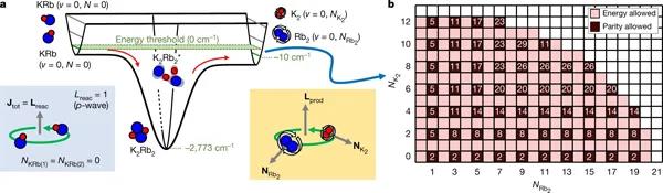 圖1 KRb分子之間超冷反應(yīng)的能量學(xué)和產(chǎn)物量子態(tài)