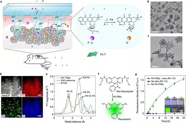 過(guò)渡金屬介導(dǎo)的生物正交催化激發(fā)了人工化學(xué)的一個(gè)新分支,與酶促反應(yīng)互補(bǔ),使生物分子的選擇性標(biāo)記或通過(guò)非自然過(guò)程原位合成生物活性劑成為可能。然而,由于金屬毒性的安全問(wèn)題和催化劑的應(yīng)用過(guò)程復(fù)雜等原因,生物正交催化在體內(nèi)的有效應(yīng)用仍然具有挑戰(zhàn)性?;诖?,浙江大學(xué)顧臻教授(通訊作者)等人報(bào)道了一種具有生物正交催化活性的微針陣列貼片裝置。作者以聚乙烯醇(PVA)為基體,沉積有鈀納米粒子(Pd NPs)的TiO2納米片(Pd-TNSs)為納米填料,制備了該微針陣列貼片裝置。其中,摻入Pd-TNSs可以增強(qiáng)微針在干玻璃狀態(tài)下的力學(xué)性能,賦予它們足夠的強(qiáng)度,以微創(chuàng)的方式穿透皮膚。當(dāng)置于水環(huán)境中時(shí),微針就會(huì)變成膨脹的水凝膠狀態(tài),形成多孔結(jié)構(gòu)。因此,三個(gè)層次的結(jié)構(gòu)層次,即三維(3D)針陣列、每個(gè)針基質(zhì)中的微孔和網(wǎng)絡(luò)中高度暴露的Pd-TNSs表面,促進(jìn)了籠狀分子的擴(kuò)散以與Pd納米粒子接觸,從而促進(jìn)了它們的活化。需注意,通過(guò)使用小鼠黑色素瘤模型,證明了系統(tǒng)給藥的前藥N-烯丙基氧羰基籠狀阿霉素(alloc-DOX)的局部腫瘤內(nèi)活化,不僅能夠增加劑量,而且限制了對(duì)健康器官和組織的副作用。此外,Pd-TNSs與PVA之間的界面相互作用以及PVA鏈形成的氫鍵使得微針針尖在水合物狀態(tài)下具有足夠的力學(xué)韌性,從而易于去除整個(gè)貼片,而不會(huì)留下有害的過(guò)渡金屬(TMs)或引起炎癥。