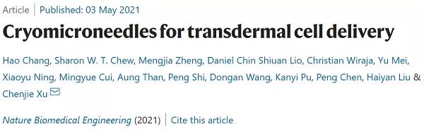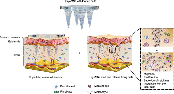 研究發(fā)現(xiàn),簡(jiǎn)單、安全和有效的治療細(xì)胞的透皮遞送技術(shù)有助于治療皮膚疾病的細(xì)胞療法。通過(guò)皮下注射針頭的常規(guī)細(xì)胞遞送與患者依從性差有關(guān),存在需要經(jīng)過(guò)培訓(xùn)的人員、產(chǎn)生廢物且具有不可忽視的傷害和感染風(fēng)險(xiǎn)的問(wèn)題?;诖?,香港城市大學(xué)Chenjie Xu(通訊作者)等人報(bào)道了一種冷凍微針貼片的設(shè)計(jì)和概念應(yīng)用,并且該冷凍微針貼片可用于活細(xì)胞的透皮傳遞。這種微針是用預(yù)先懸浮的細(xì)胞在低溫培養(yǎng)基中進(jìn)行分步低溫微模塑法制備而成,在細(xì)胞復(fù)蘇后可以很容易插入豬皮中溶解。在小鼠體內(nèi),冷凍微針遞送的細(xì)胞保留了它們的生存能力和增殖能力。在患有皮下黑色素瘤的小鼠中,通過(guò)冷凍微針遞送的卵清蛋白脈沖的樹(shù)突狀細(xì)胞引起了更高的抗原特異性免疫反應(yīng),并且導(dǎo)致腫瘤生長(zhǎng)比靜脈和皮下注射的細(xì)胞更慢。具有生物相容性的冷凍微針可促進(jìn)微創(chuàng)細(xì)胞遞送,用于一系列的細(xì)胞治療。