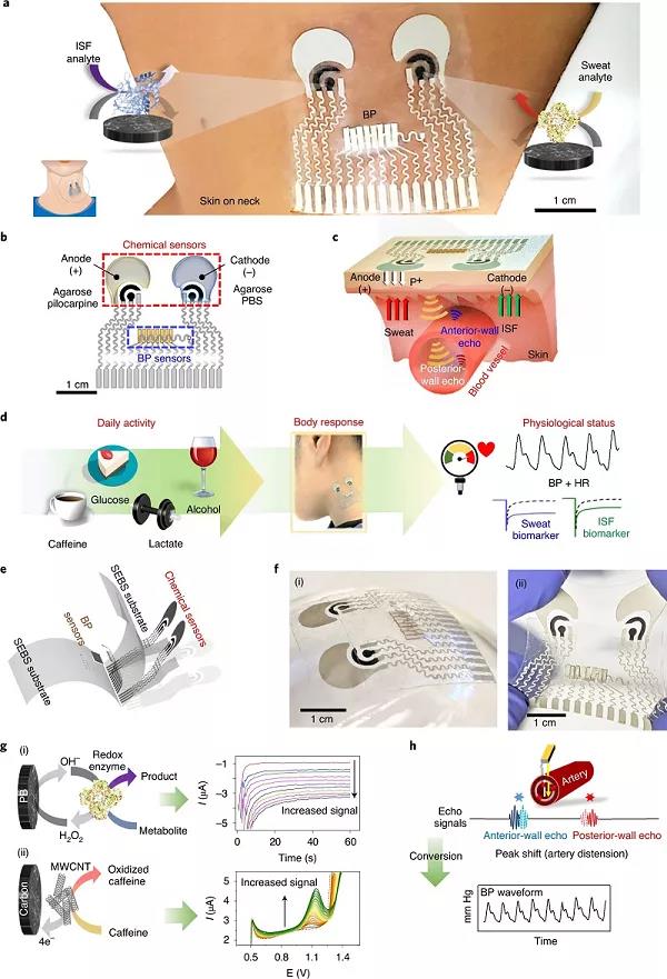 為了監(jiān)測(cè)日?;顒?dòng)對(duì)人體生理反應(yīng)的影響,需要一種能夠同時(shí)跟蹤代謝和血流動(dòng)力學(xué)參數(shù)的可穿戴器件?;诖耍?/span>美國(guó)加州大學(xué)圣地亞哥分校Joseph Wang和Sheng Xu(共同通訊作者)等人報(bào)道了一種非侵入性皮膚穿戴器件,通過(guò)超聲波傳感器同時(shí)監(jiān)測(cè)血壓和心率,并通過(guò)電化學(xué)傳感器同時(shí)監(jiān)測(cè)多種生物標(biāo)志物。作者優(yōu)化了集成器件,使其在符合彎曲皮膚表面的同時(shí)提供力學(xué)彈性和靈活性,并且確保可靠地感知組織間液中的葡萄糖和汗液中的乳酸、咖啡因和酒精,而各個(gè)傳感器之間沒(méi)有串?dāng)_。在人類(lèi)志愿者身上,該器件捕捉到了食物攝入和運(yùn)動(dòng)的生理效應(yīng),特別是在食物消化后葡萄糖的產(chǎn)生,通過(guò)糖酵解消耗葡萄糖,以及血壓和心率的增加,以補(bǔ)償氧氣的消耗和乳酸的產(chǎn)生。通過(guò)集成的可穿戴器件進(jìn)行連續(xù)、同步的聲學(xué)和電化學(xué)傳感,可以豐富對(duì)人體日?;顒?dòng)響應(yīng)的理解,并且有助于對(duì)異常生理變化的早期預(yù)測(cè)。