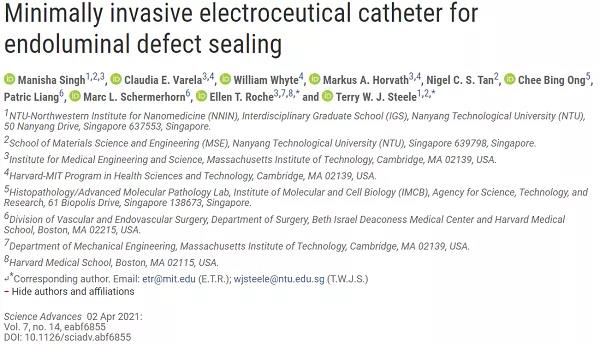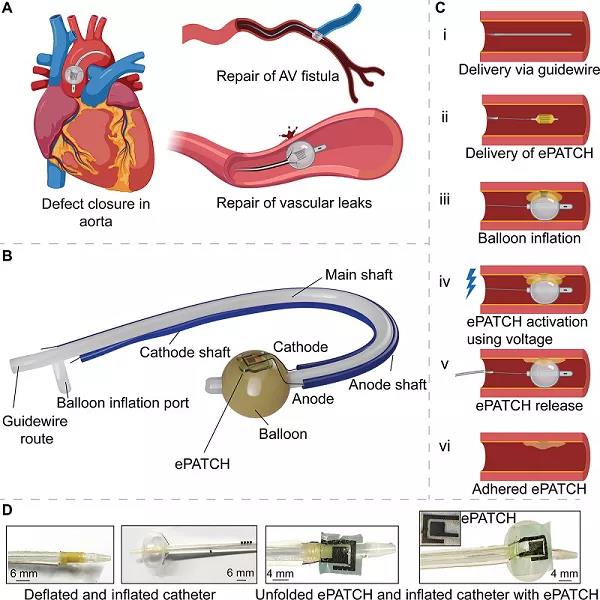 腔內(nèi)缺損的外科手術(shù)修復(fù)與圍手術(shù)期發(fā)病率和死亡率有關(guān)。利用組織粘合劑進(jìn)行血管內(nèi)修復(fù)可以減少宿主組織損傷,但是目前的生物粘合劑設(shè)計(jì)不支持微創(chuàng)部署。其中,電壓激活的組織粘合劑為腔內(nèi)修復(fù)提供了一種新的策略。為了促進(jìn)電壓激活粘合劑的臨床轉(zhuǎn)化,新加坡南洋理工大學(xué)Terry W. J. Steele和麻省理工學(xué)院Ellen T. Roche(共同通訊作者)等人報(bào)道了將一種電壓激活貼片(ePATCH)與一種帶有可拉伸電極的微創(chuàng)導(dǎo)管(CATRE)配對(duì),以對(duì)抗體內(nèi)和體外管腔缺陷的修復(fù)。ePATCH/CATRE平臺(tái)展示了在濕組織基底上密封直徑高達(dá)2 mm的管腔缺損。防水密封件具有柔韌性和回彈力,可承受20000多次生理相關(guān)的應(yīng)力/應(yīng)變循環(huán)。當(dāng)心臟跳動(dòng)時(shí),ePATCH被電激活,沒(méi)有觀察到電信號(hào)中斷。ePATCH/CATRE平臺(tái)具有廣泛的潛在應(yīng)用,從假性動(dòng)脈瘤/瘺的血管內(nèi)治療到生物電極,再到電生理標(biāo)測(cè)。