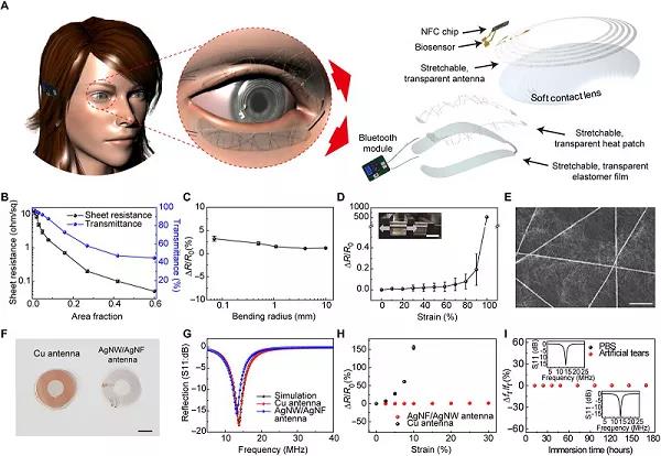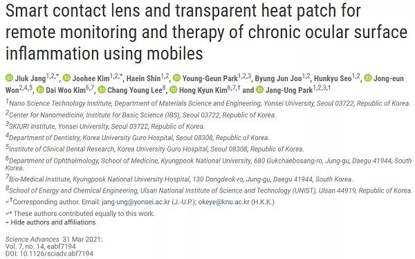 可穿戴電子器件能夠監(jiān)測(cè)人體的生理信號(hào),提供生物醫(yī)學(xué)信息,已成為可持續(xù)的個(gè)人健康管理領(lǐng)域的熱點(diǎn)。基于此,韓國(guó)延世大學(xué)Jang-Ung Park和韓國(guó)慶北大學(xué)Hong Kyun Kim(共同通訊作者)等人報(bào)道了一種用于無(wú)線監(jiān)測(cè)和治療慢性眼表炎癥(OSI)的柔性、智能隱形眼鏡和可連接皮膚的治療器件的人類(lèi)先導(dǎo)性實(shí)驗(yàn)。作為一種診斷器件,這種智能隱形眼鏡能夠使用石墨烯場(chǎng)效應(yīng)晶體管實(shí)時(shí)測(cè)量淚液中基質(zhì)金屬蛋白酶-9(OSI的生物標(biāo)志物)的濃度。作為一種治療器件,作者還制備了一種可拉伸、透明的貼片,可以貼附在人眼瞼上。其中診斷和治療器件都可以使用智能手機(jī)進(jìn)行無(wú)線通信,從而實(shí)現(xiàn)OSI的實(shí)時(shí)診斷和自動(dòng)熱療。此外,作者利用活體動(dòng)物和人體進(jìn)行的體內(nèi)實(shí)驗(yàn)證實(shí),作為一種無(wú)創(chuàng)、可移動(dòng)的保健解決方案,它們具有良好的生物相容性和可靠性。