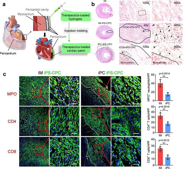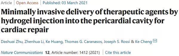心臟貼片是一種向心臟遞送治療藥物的有效方法。然而,這種手術(shù)通常是侵入性且很難進(jìn)行的?;诖?,美國(guó)北卡羅萊納州立大學(xué)Ke Cheng(通訊作者)等人開(kāi)發(fā)并測(cè)試一種方法,利用心包腔作為一個(gè)自然模型,在心包內(nèi)注射生物相容性水凝膠中的治療藥物后原位形成心臟貼片。在嚙齒類(lèi)動(dòng)物心肌梗死模型中,作者證明了心包內(nèi)注射是一種有效且安全的方法來(lái)遞送含有誘導(dǎo)多能干細(xì)胞衍生的心臟前體細(xì)胞或間充質(zhì)干細(xì)胞來(lái)源的外泌體的水凝膠。在注射后,水凝膠在心包腔形成心臟貼片狀結(jié)構(gòu),減輕免疫反應(yīng),增加治療藥物的心臟滯留時(shí)間。通過(guò)強(qiáng)大的心血管修復(fù)和心外膜源性細(xì)胞的刺激,遞送的治療減輕心臟重構(gòu)和改善心肌梗死后心臟功能。此外,作者在臨床相關(guān)的豬模型上證明了微創(chuàng)心包內(nèi)注射的可行性??傊撗芯孔C實(shí)了心包內(nèi)注射是一種安全有效的方法,可以將治療性水凝膠遞送到心臟進(jìn)行心臟修復(fù)。