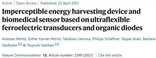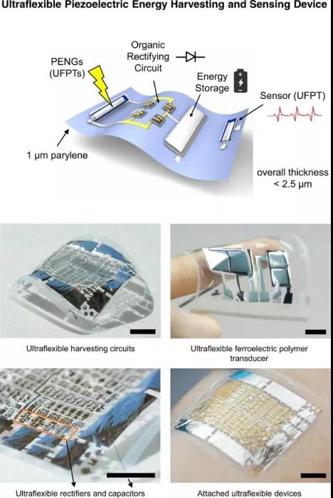 能源自主性和整合性是下一代可穿戴和柔性電子產(chǎn)品的基本要素,用于醫(yī)療保健、機(jī)器人和信息物理系統(tǒng)?;诖?,日本大阪大學(xué)Tsuyoshi Sekitani和奧地利Barbara Stadlober(共同通訊作者)等人首次報(bào)道了一種由壓電納米發(fā)電機(jī)、二極管整流器和儲(chǔ)能電容組成的綜合性超柔性能量收集器件(UEHD),所有組件的厚度均不超過(guò)2.5 μm,在僅1 μm的聚對(duì)二甲苯制成的薄基板上制成。當(dāng)附著在人體皮膚的表面上時(shí)難以察覺(jué),作者展示了一種鐵電無(wú)線電子保健貼片,可以監(jiān)測(cè)脈搏率并測(cè)量血壓。納米發(fā)電機(jī)和傳感器都是基于P(VDF:TrFE)70:30的超柔性鐵電聚合物傳感器(UFPTs)。同時(shí),結(jié)合了由有機(jī)二極管制成的超柔性全波整流器電路,具有短O(píng)TFT幾何形狀和超柔性薄膜電容器使用納米氧化鋁薄層。作者采用DNTT(二萘并噻吩)作為有機(jī)半導(dǎo)體的二極管顯示出很高的整流比,超過(guò)107,并且由于它們的過(guò)電壓低于100 mV,因此內(nèi)置的電壓降可忽略不計(jì)。其中,UFPTs具有以下優(yōu)點(diǎn):(1)超柔韌性,使其能夠共形附著于各種材料和表面,并允許將多層UFPTs堆疊在3D形狀的載體上;(2)對(duì)平面外(橫向)應(yīng)力的高靈敏度,可通過(guò)多層堆疊提高,從而實(shí)現(xiàn)預(yù)彎曲橡膠載體上三層堆疊的峰值靈敏度在15 nC N-1范圍內(nèi);(3)極好的機(jī)械穩(wěn)定性,允許在40 μm彎曲半徑下穩(wěn)定運(yùn)行;(4)響應(yīng)時(shí)間非常短,遠(yuǎn)低于20 ms N-1。此外,UFPTs用作脈沖電源時(shí),峰值功率密度超過(guò)3 mW cm-3。