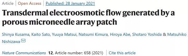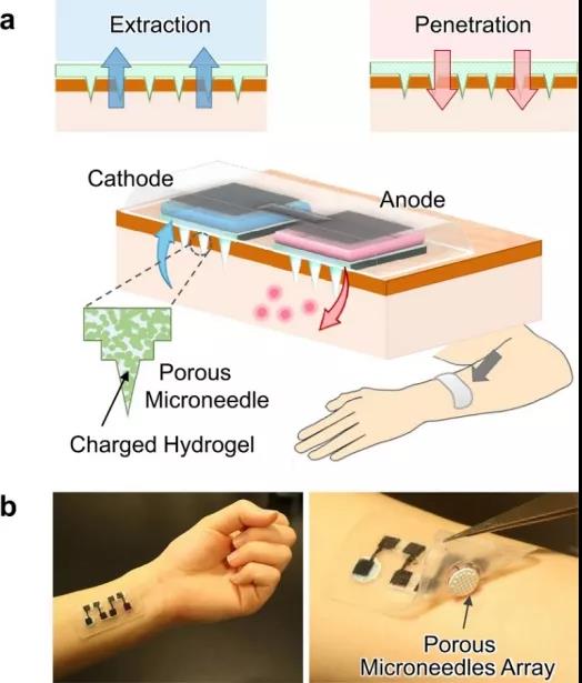 微針陣列是一種具有吸引力的選擇,通過(guò)微創(chuàng)手段來(lái)突破皮膚屏障進(jìn)行有效的透皮給藥?;诖耍?/span>日本東北大學(xué)Matsuhiko Nishizawa(通訊作者)等人報(bào)道了一種基于固體聚合物的離子導(dǎo)電多孔微針(PMN)貼片,其可應(yīng)用于改善離子透入方面,是一種通過(guò)皮膚的直流電增強(qiáng)透皮分子傳輸?shù)募夹g(shù)。利用帶電水凝膠修飾的PMN在離子電滲療法中有以下三個(gè)創(chuàng)新優(yōu)勢(shì):(1)通過(guò)低侵入性穿刺高阻力角質(zhì)層來(lái)降低透皮阻力;(2)通過(guò)相互連接的微孔輸送大分子;(3)產(chǎn)生電滲流(EOF)。特別是,PMN產(chǎn)生的EOF極大地提高了透皮分子的滲透或提取,類(lèi)似于由外部壓力引起的流動(dòng)。作者利用豬皮樣品證明了EOF輔助遞送模型藥物(右旋糖酐)和葡萄糖提取的提高效率。此外,通過(guò)內(nèi)置的酶生物電池(果糖/O2電池)為基于PMN的透皮EOF系統(tǒng)供電也被證明是一種可能的全有機(jī)離子導(dǎo)入貼片。