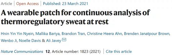 在久坐和日常活動(dòng)中,人體自然持續(xù)地分泌汗液進(jìn)行體溫調(diào)節(jié),其速率可以反映潛在的健康狀況,包括神經(jīng)損傷、自主神經(jīng)和代謝紊亂以及慢性應(yīng)激。然而,低分泌率和蒸發(fā)對(duì)收集靜止的體溫調(diào)節(jié)汗液進(jìn)行無(wú)創(chuàng)的身體生理學(xué)分析提出了挑戰(zhàn)?;诖耍?/span>美國(guó)加州大學(xué)伯克利分校Ali Javey(通訊作者)等人報(bào)道了一種可穿戴式的貼片,將其用于在休息時(shí)連續(xù)監(jiān)測(cè)汗液,使用微流控技術(shù)來(lái)防止蒸發(fā),并且實(shí)現(xiàn)對(duì)分泌速率的選擇性監(jiān)測(cè)。作者將用于快速吸汗的親水性填充物集成到傳感通道中,減少了實(shí)時(shí)測(cè)量所需的汗液累積時(shí)間。此外,作者還集成了用于pH、Cl-和左旋多巴監(jiān)測(cè)的電化學(xué)傳感器。作者還展示了與日常活動(dòng)、應(yīng)激事件、低血糖引起的出汗和帕金森病相關(guān)的動(dòng)態(tài)出汗分析的貼片功能。通過(guò)支持與久坐、常規(guī)和日常活動(dòng)兼容的汗液分析,這些貼片可以在休息時(shí)對(duì)身體生理進(jìn)行連續(xù)、自主的監(jiān)測(cè)。