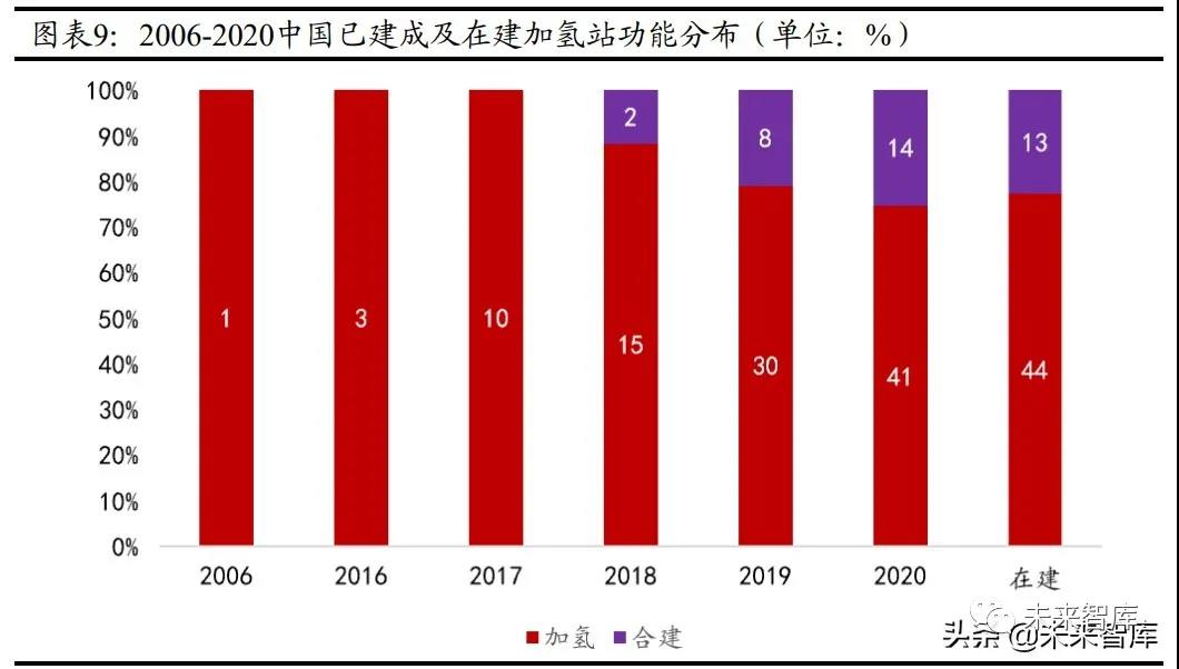 從加氫站的功能來看,國內(nèi)合建站占比逐年提高。根據(jù)《加氫站技術(shù)規(guī)范(國標(biāo) GB50516-2010)》,加氫站可以單站建設(shè), 但具有需要重新選址、投入成本高等弊端而 建設(shè)綜合加注站可以降低運(yùn)營成本。國內(nèi)目前正積極探索“油、氫、氣、電”的聯(lián)合 建設(shè)運(yùn)營模式,中石油、中石化等央企已開始進(jìn)行相關(guān)的研發(fā)和建設(shè)。