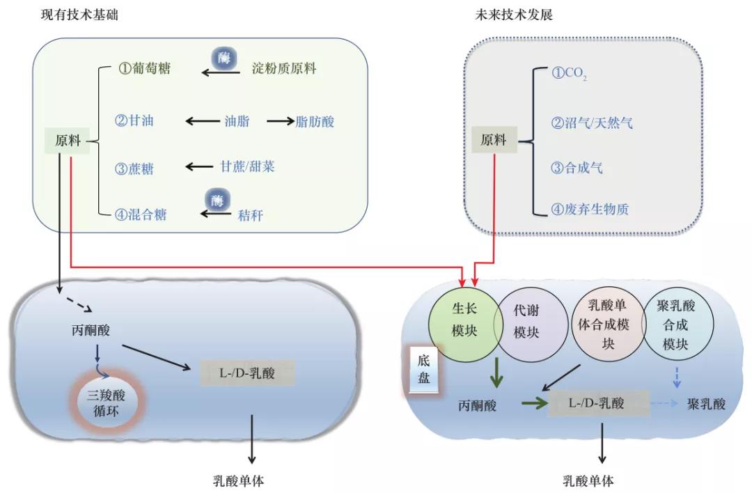其他可能的乳酸單體生產(chǎn)原料。在分子克隆技術(shù)發(fā)明 50 年后、人類基因組計(jì)劃實(shí)施 30 年后的今天,對選定出發(fā)菌株的特定基因和 / 或全基因組修飾與精細(xì)調(diào)整已經(jīng)成為現(xiàn)實(shí),這將賦予生產(chǎn)菌株以更好的原料利用屬性和生產(chǎn)屬性。因此,合成生物學(xué)技術(shù)為未來聚乳酸生產(chǎn)提供了全新的可能性:通過底盤生物的創(chuàng)制、分子遺傳模塊(如生長繁殖模塊、特殊代謝模塊、乳酸單體合成模塊、聚乳酸合成模塊)的優(yōu)化組合,有可能利用廢棄生物質(zhì)、沼氣、天然氣、合成氣、CO2 等,為直接原料生物合成乳酸單體甚至直接生物合成聚乳酸(見圖 2)。